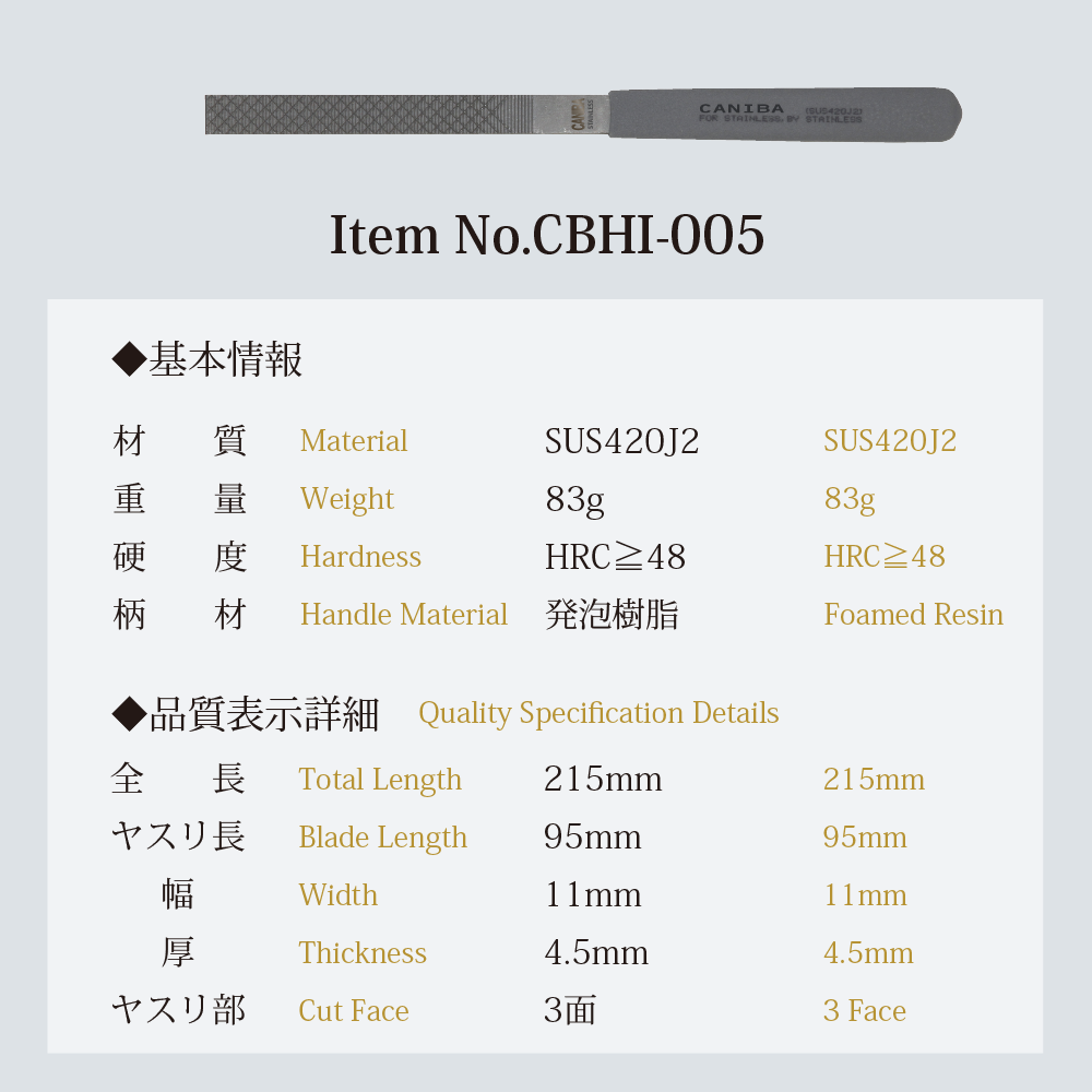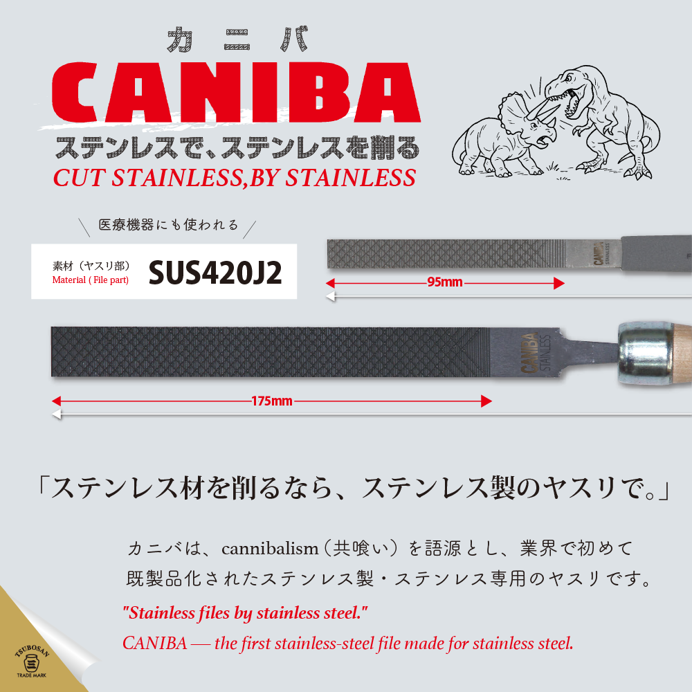 「ステンレス加工のために生まれた、唯一のステンレス製ヤスリ。」カニバは、その名の由来である cannibalism(共喰い) のごとく、ステンレス材を削るために自らもステンレスで作られた、業界初の既製品ステンレス製ヤスリです。従来のヤスリでは十分な性能を発揮